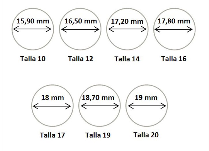 elige uno de tus anillos para calcular tu talla o el de la persona a la que se lo quieres regalar. Coloca el anillo sobre una superficie plana y con una regla mide el diámetro inferior del anillo y anota esa medida en milímetros (mm). Busca la correspondencia de tu talla en mm en la tabla que te mostramos abajo.