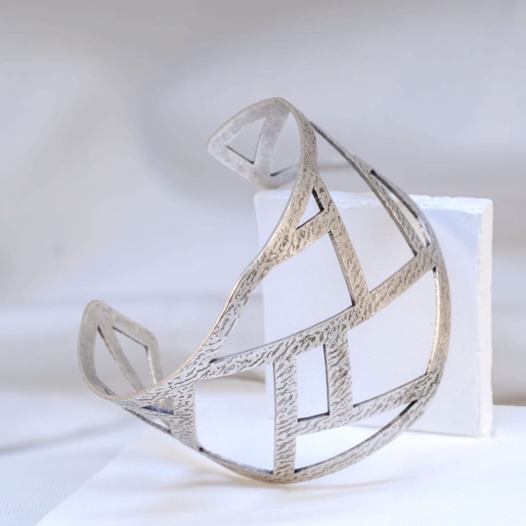 Pulsera cuff de zamak bañado en plata con diseño arquitectónico y textura martillada. Moderna, elegante y ajustable, perfecta para destacar tu estilo único.