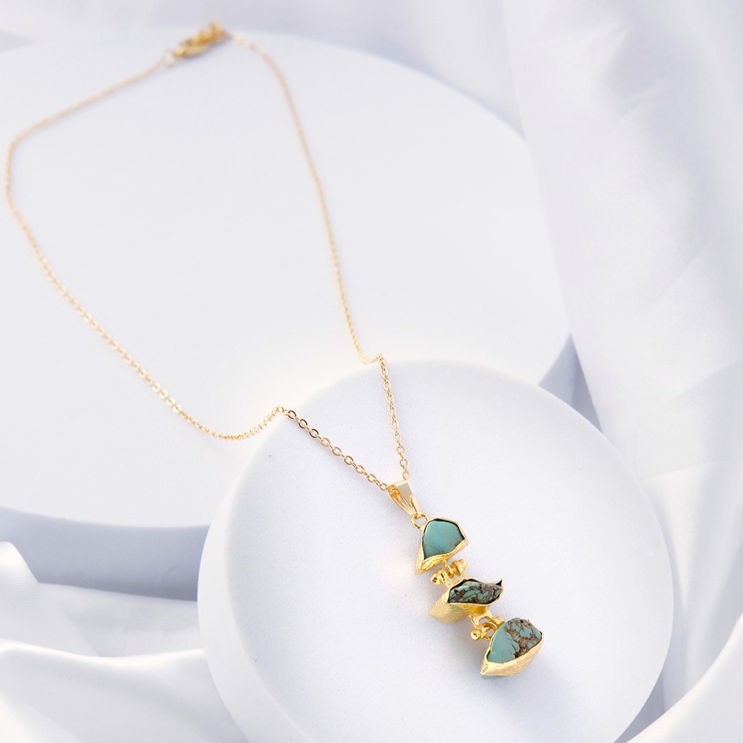 Tres piedras de turquesa natural apiladas en cadena dorada fina. Cada una única, con sus propias vetas y tonos. Delicado pero con presencia. Ligero, versátil y con ese toque de color que necesitas. ✨ Dato: la turquesa siempre ha sido piedra de protección y buena energía.