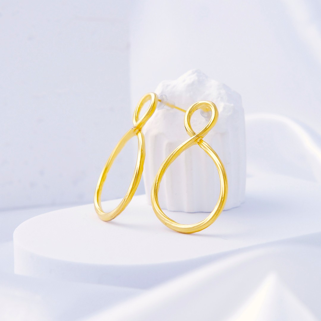 Sofisticados pendientes dorados con diseño de doble gota que forman un elegante símbolo de infinito. Su estructura ligera y hueca aporta movimiento sin peso, perfectos para llevar desde el día hasta la noche. Un clásico atemporal que simboliza conexiones eternas y estilo sin límites.