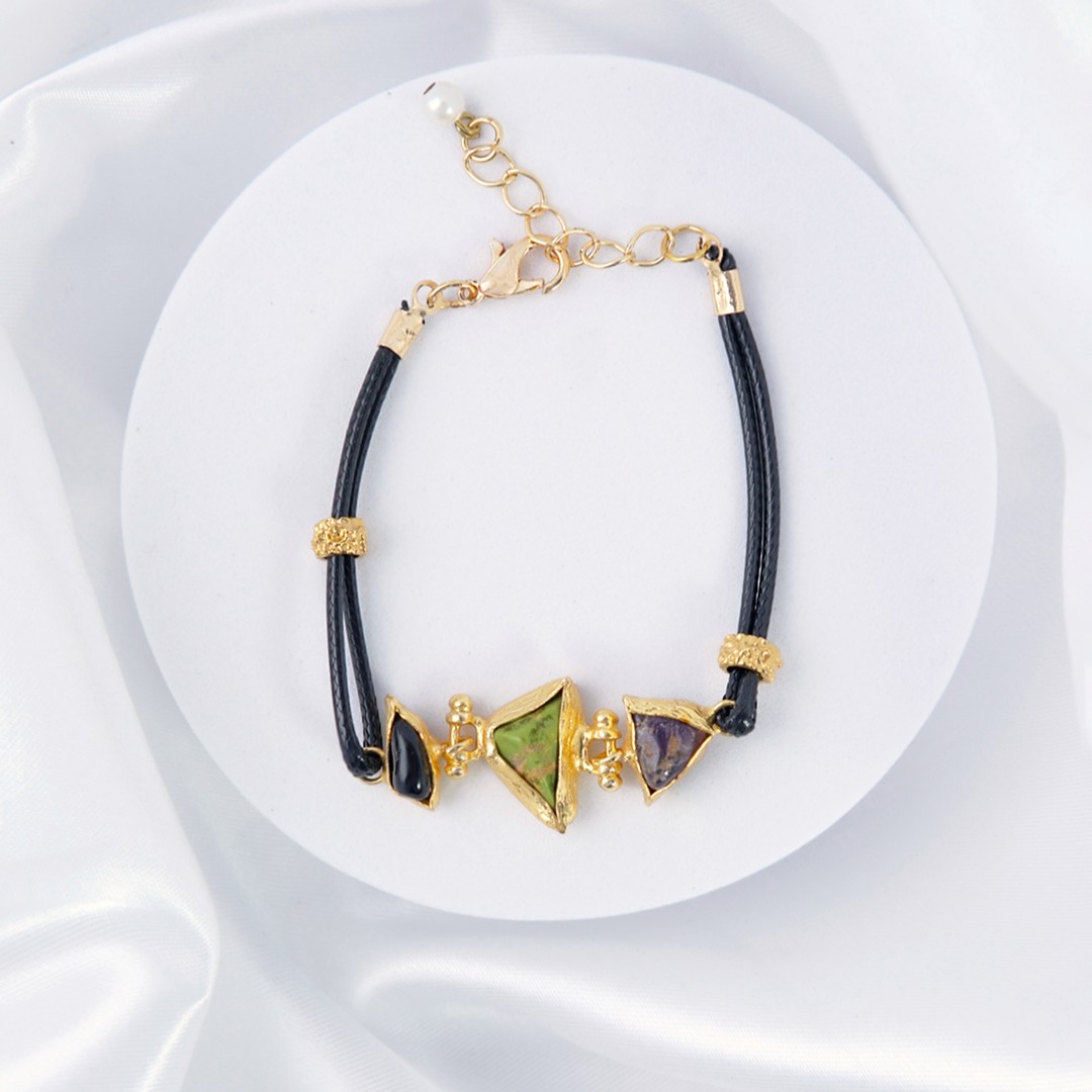 Cordón negro con piedras naturales engarzadas en oro: verde, morado y negro en formas geométricas. Cada piedra es única y el contraste con el cordón le da un rollo boho-chic irresistible. ✨ Ese mix de casual y elegante que siempre funciona.