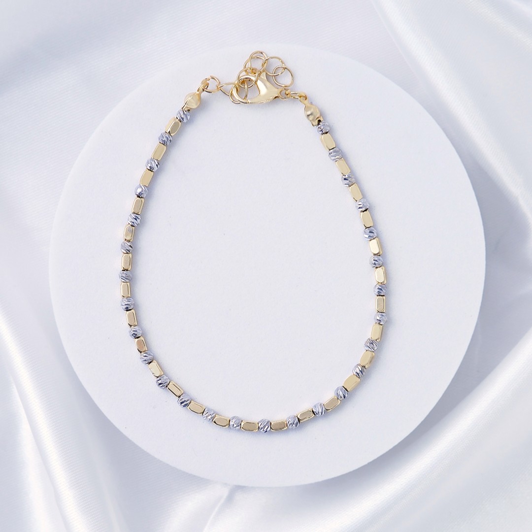 Cuentas de tubitos en oro y bolitas plata alternadas. Perfecta sola o con otras. Ligera y cómoda para el día a día.